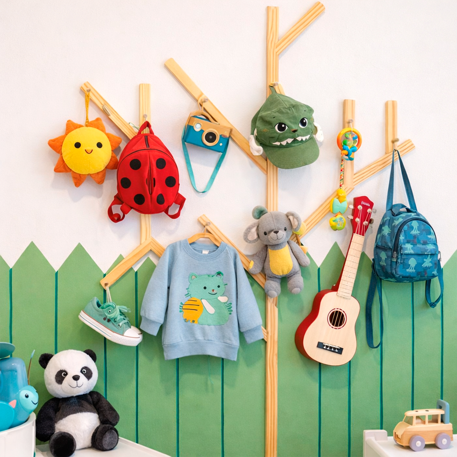 O cabideiro de parede da linha Montessori da Madeira Prime é projetado em forma de árvore, os suportes penduradores são dispostos ao longo das peças para pendurar bichinhos de pelúcia, bolsas e sacolas, casacos e cachecóis, e vai se destacar no espaço infantil. Pensando em facilitar na hora de instalar, cada peça de madeira deve ser fixada com fita alto-colante de grande resistência, o que vai facilitar muito na hora da instalação, não necessitando de realizar furos na parede. Você poderá fixar as peças na disposição que desejar. Este cabideiro é composto de 8 peças de 60cm, 5 peças menores de 30cm e 9 suportes penduradores de 5cm.