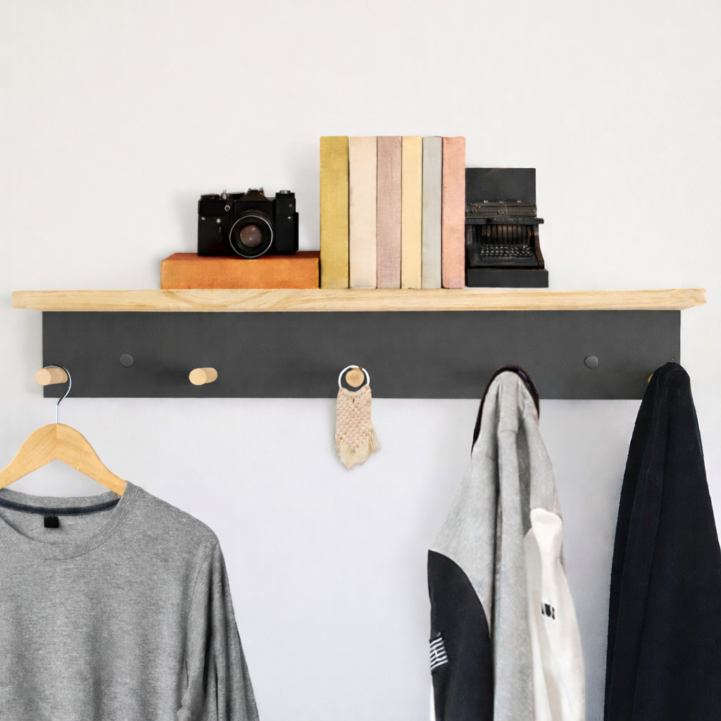 Com 5 suportes penduradores e uma prateleira superior, este cabideiro horizontal vai se sair muito bem na sua parede. Fácil de instalar este cabideiro te ajudará a ter mais facilidades ao organizar suas roupas e acessórios, chaves, guarda-chuvas, bolsas, casacos, cachecóis e gravatas. Não perca a chance de dar esse toque de organização para esses pequenos objetos pessoais. As peças em madeira recebem acabamento arredondados nas bordas.