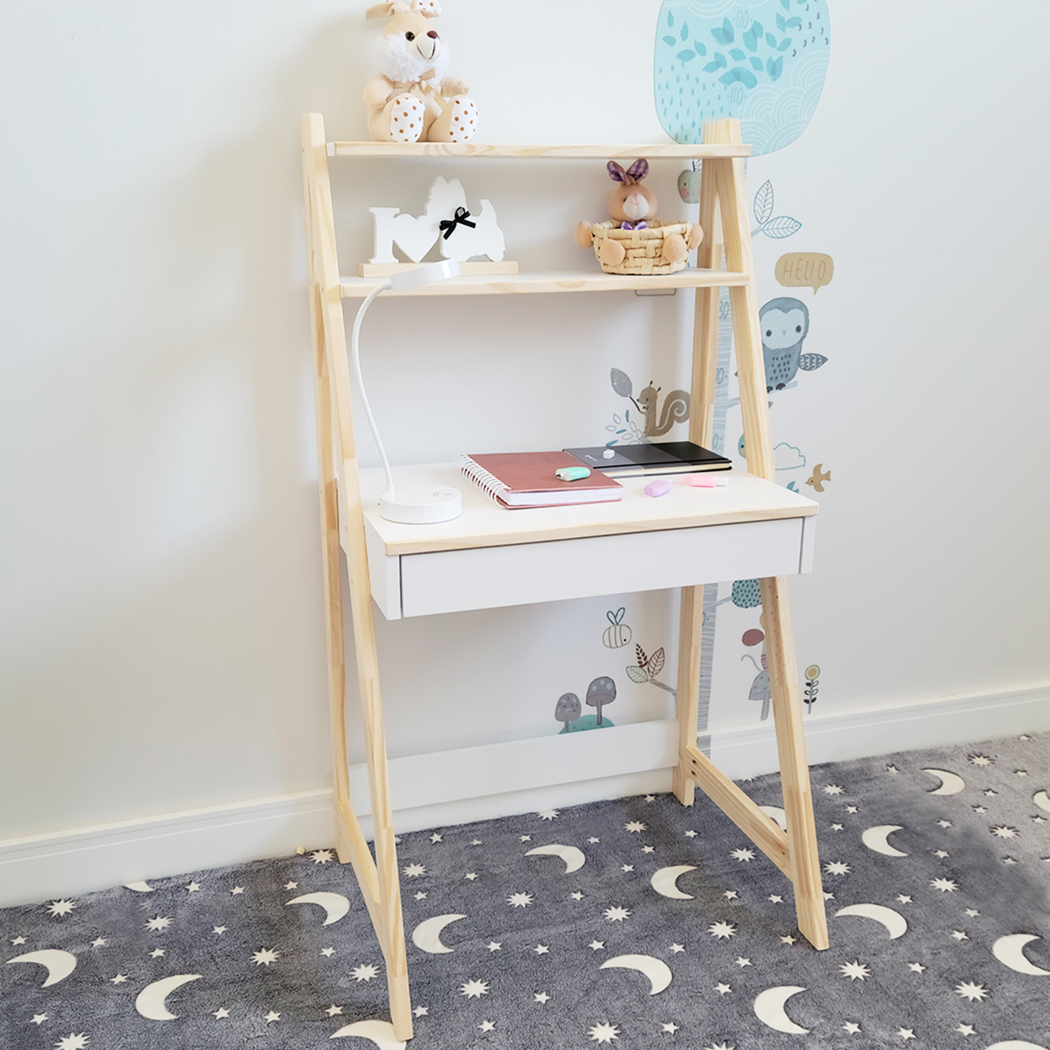 As dimensões da base da escrivaninha, medindo 55cm de largura por 36cm de profundidade, garantem espaço suficiente para os estudos da criança. Além disso, a gaveta com corrediças metálicas e as duas prateleiras oferecem ainda mais espaço para acomodar e organizar material de estudo, cadernos e outros objetos.